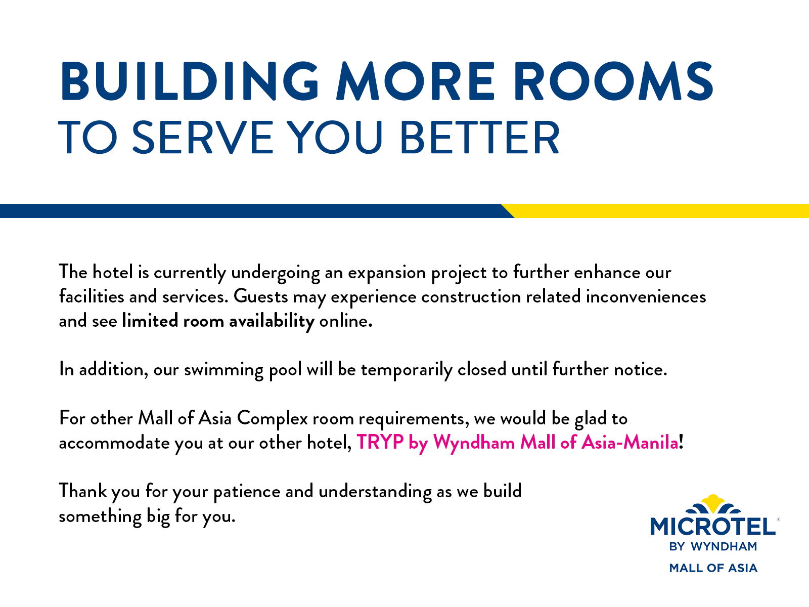 Microtel by Wyndham Mall of Asia is a 150-room hotel located at the best shopping, business, leisure, and entertainment complex in Pasay City, Metro Manila, Philippines. Make your stay brilliantly simple with Microtel’s smart design, modern rooms, and exceptional service.